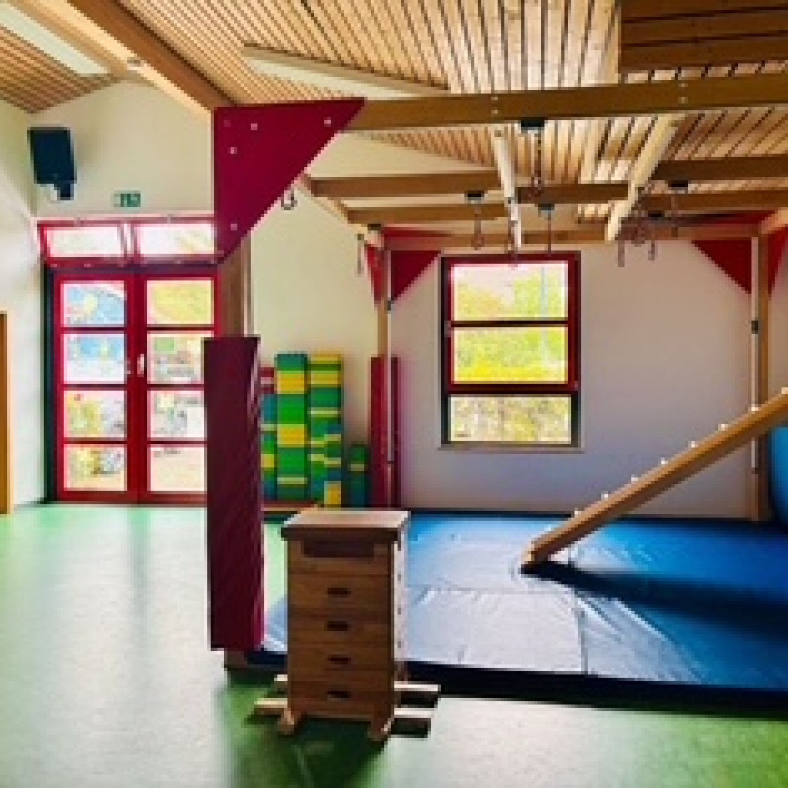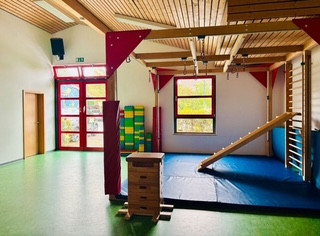 - Wöchentliches Kinderturnen: Einmal pro Woche besuchen wir die nahe gelegene Kita zum gemeinsamen Turnen. In der großen Halle können die Kinder klettern, rennen und ihre motorischen Fähigkeiten spielerisch im Austausch mit anderen Kindern erweitern.